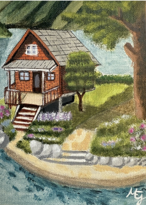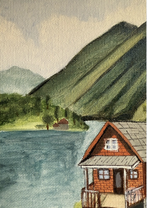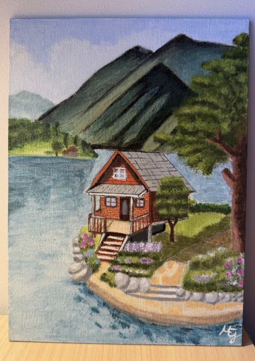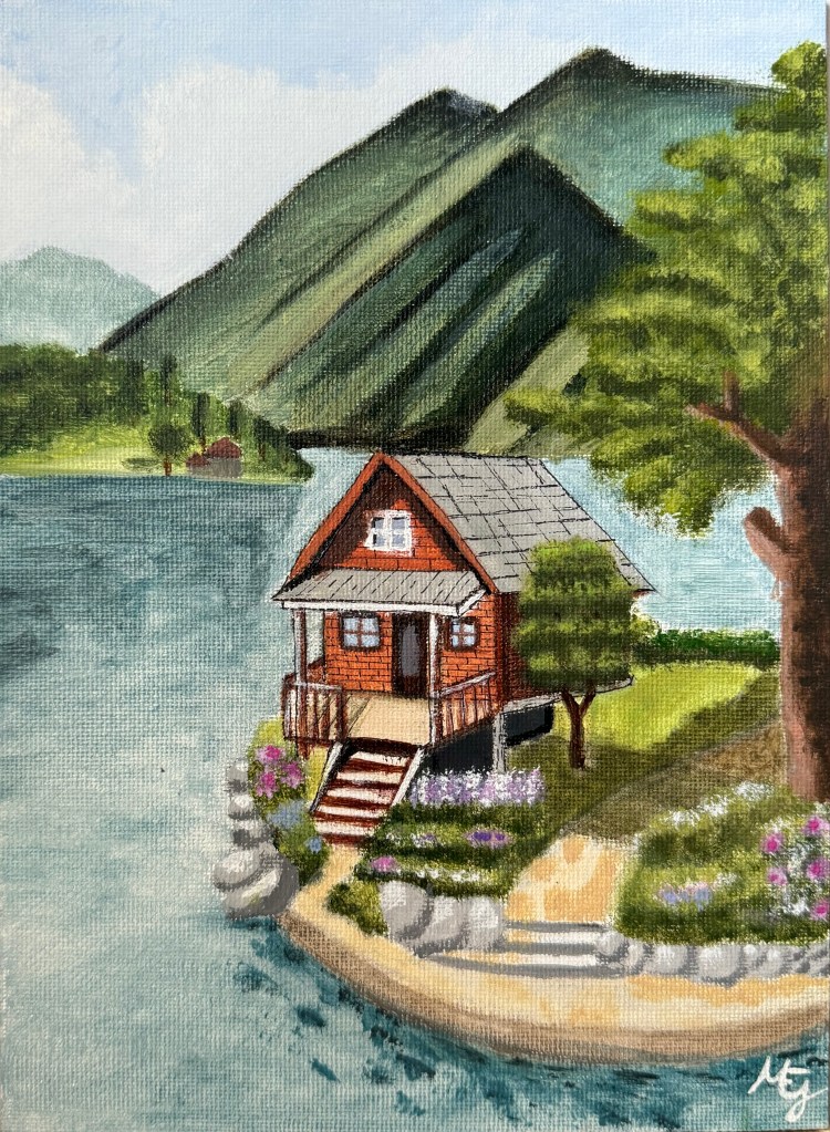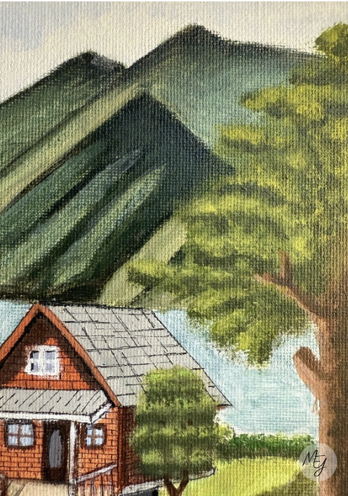 Pintar este cuadro también fue un reto para mí: trabajar las luces y las sombras de la cabaña, integrar el camino y las montañas… no fue nada sencillo. Pero precisamente por eso me siento aún más orgullosa del resultado y con muchas ganas de seguir aprendiendo y mejorando en cada nuevo lienzo.