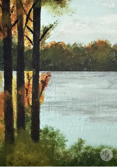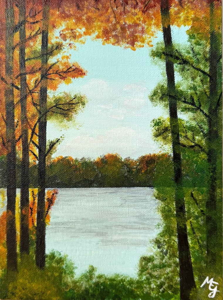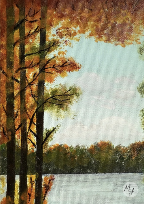Represento un paisaje sereno, visto a través de un grupo de árboles que enmarcan un lago tranquilo. Lo especial de estos árboles es que la mitad de ellos evocan la frescura de la primavera y el verano, mientras que la otra mitad muestran los cálidos colores del otoño. Este contraste no solo refleja el paso del tiempo, sino también ese cambio sutil de espacio y energía que sentimos cuando cambiamos de estación, con objetivos nuevos y perspectivas muy diferentes.