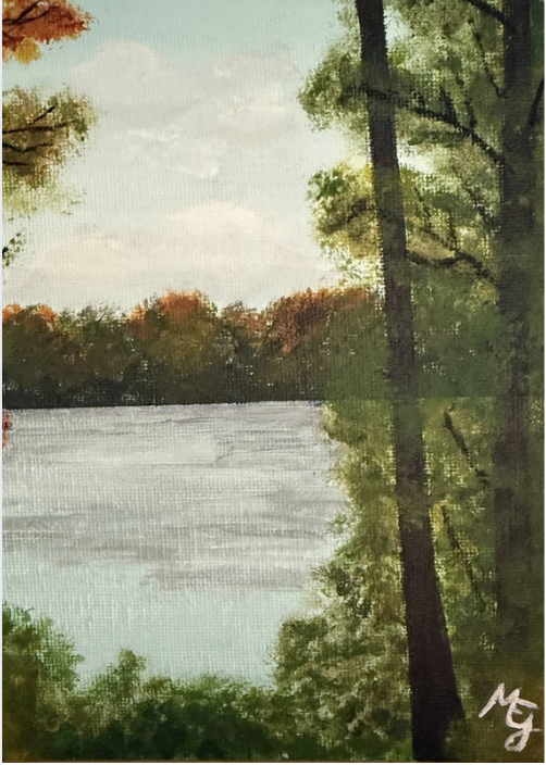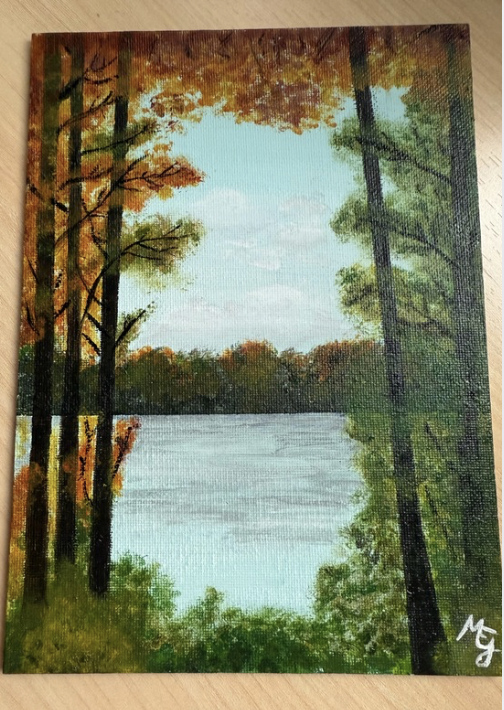 La naturaleza ha sido siempre mi mayor fuente de inspiración. Los paisajes, los animales, los sonidos del bosque o el reflejo del cielo en el agua… todo eso me conecta, me da paz y me hace sentir en casa. Por eso, este lienzo lleva algo muy personal: es una pausa visual, una ventana imaginaria hacia un lugar donde el tiempo se detiene y solo queda el susurro del viento entre los árboles.