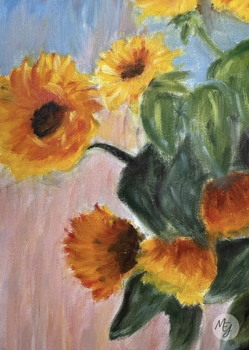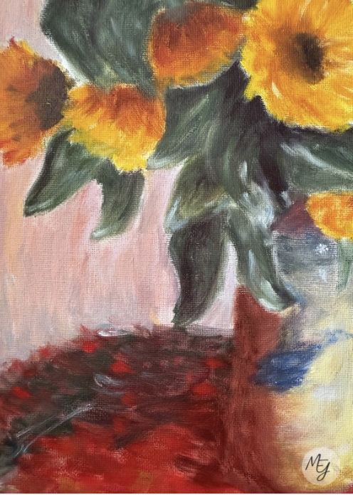 Fue un trabajo complejo, sobre todo porque era la primera vez que experimentaba con la mezcla de colores. Tuve que aprender a integrar el fondo con la intensidad de los pétalos, jugar con las diferentes sombras de las hojas y conseguir que los tonos se equilibraran entre sí. No fue un cuadro que, de inicio, me motivase especialmente representar, pero precisamente por eso se convirtió en un desafío que me permitió salir de mi zona de confort.