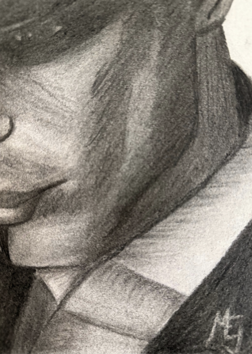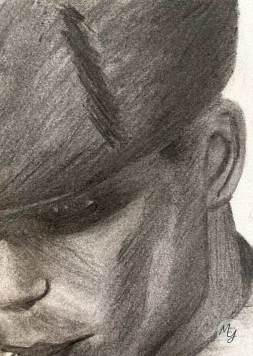 Durante el proceso, lo que más me costó trabajar fueron los ojos y la boca, zonas con mucha profundidad que requerían equilibrio para no perder naturalidad. Aun así, el carboncillo me permitió rectificar fácilmente hasta conseguir el resultado. Me gustó cómo los contrastes finales reflejaban esa fuerza, oscuridad y templanza del personaje. En mi opinión ha quedado un dibujo que transmite mucho misterio y seguridad al mismo tiempo.