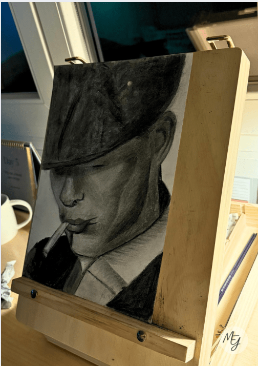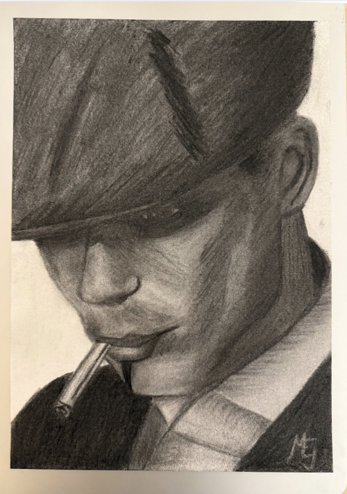 Estaba muy ilusionada por representar al protagonista de Peaky Blinders. Su personalidad y estética encajaban perfectamente con el carácter del carboncillo: sobrio, fuerte y lleno de contrastes.