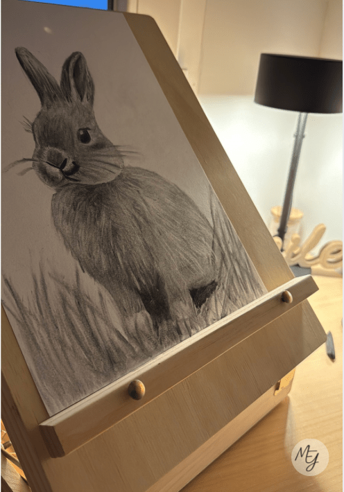 En esta foto se puede ver el momento en el que estaba haciendo este dibujo en mi habitación. Estaba relajada, contenta y disfrutando de verdad del proceso. Recuerdo que estrené mi caballete transportable, algo que hizo la tarde aún más especial para mí.