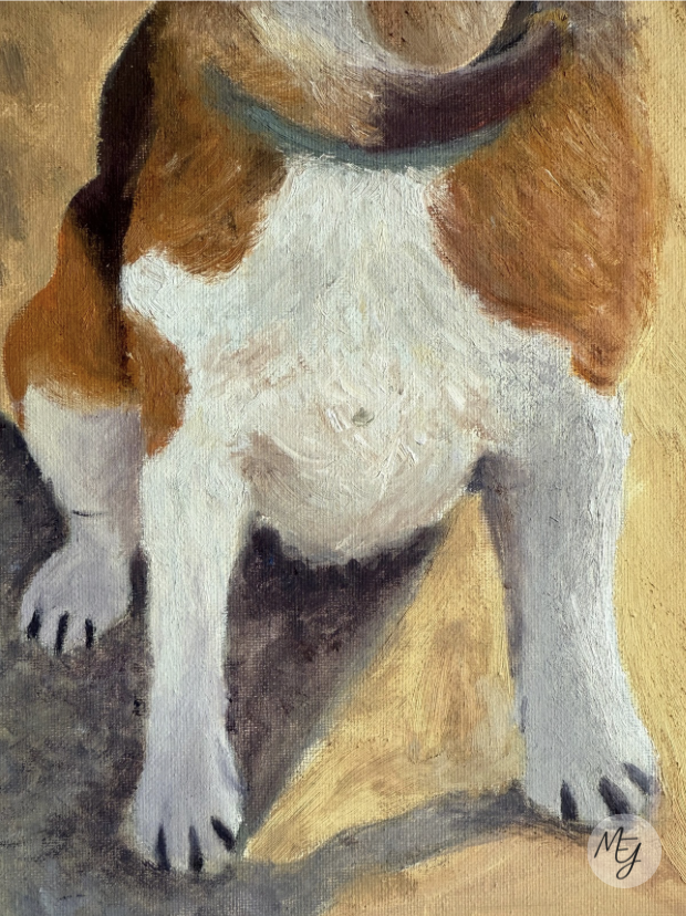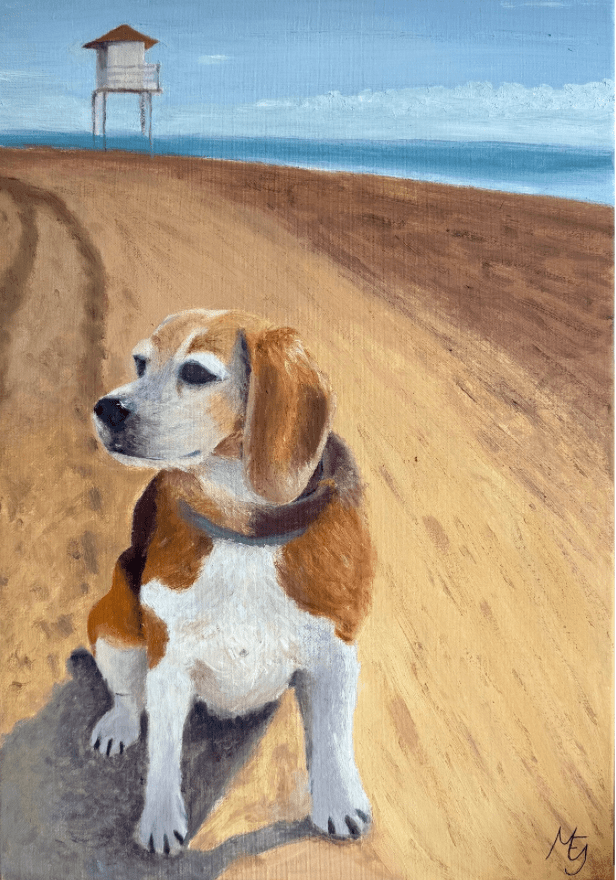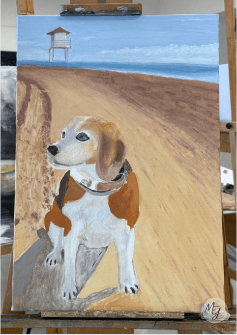 Después del dibujo, empecé a trabajar el color. Primero apliqué una capa de mancha para establecer los tonos base y comprobar que la paleta funcionaba correctamente. Esta etapa me ayudó a asegurarme de que Luna quedara bien integrada en el lienzo y que su figura destacara como auténtica protagonista. Después pasé a la capa definitiva, trabajando tono por tono y prestando mucha atención a las texturas para que su pelaje y sus rasgos se entendieran con claridad. Este último paso me llevó varias semanas, ya que quería que cada detalle reflejara lo que hace a Luna tan especial.
